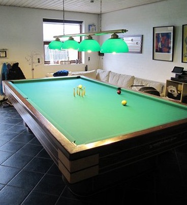 | Grindsted Billard & Mørck's billard bord 1/1 match. Med skiffer, varme og gummibander. Medfølger: 5 stk. Køer (2 stk. To-delte), 1 stk. mini kø, 2 stk ’hjælpere’(brohoved), 1 stk. Kø-stativ til 6, 1 stk. Point skyde tavle, 1 sæt kegler plus kegle baller, 1 sæt pool baller plus trekant, 1 stk. Billard lampe Canopy m. 4 lamper samt 1 stk. Varmetæppe |